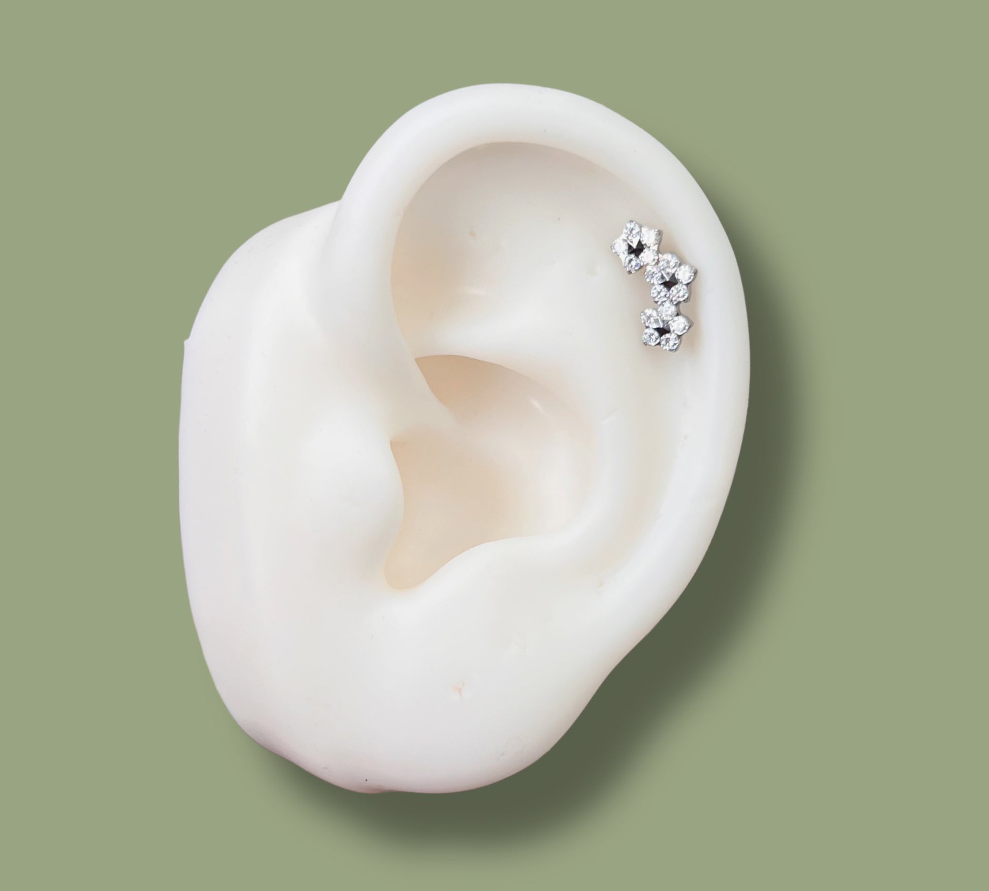 Trio di fiori brillanti di cubic zirconia, chiusura a filettatura interna.
