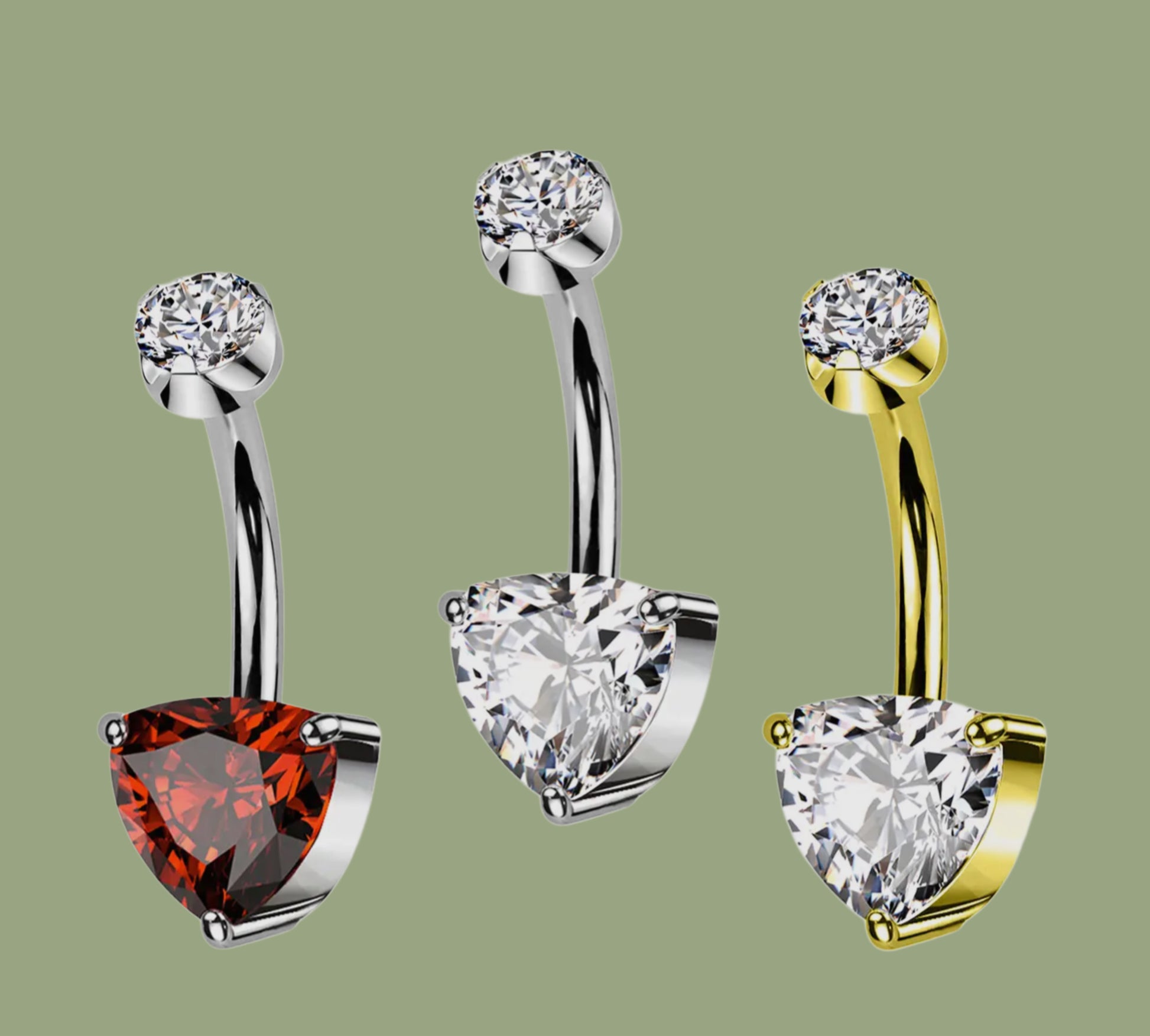 Gioiello per ombelico con zircone a taglio triangulate, chiusura a filettatura interna.